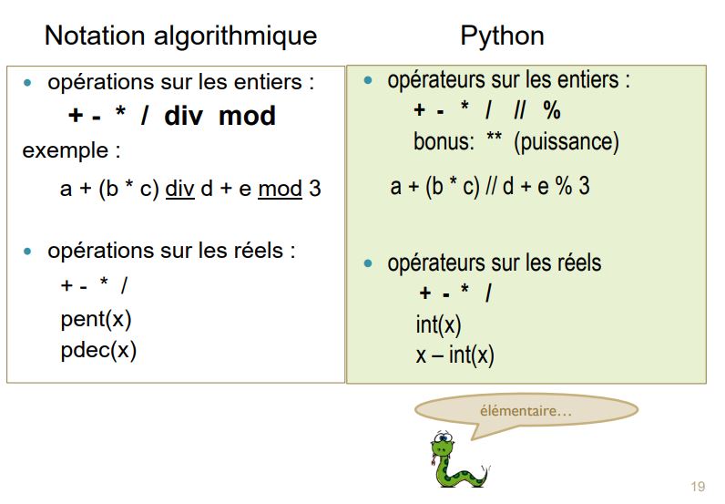 Pour que les algorithmes puissent effectuer des calculs, il faut pouvoir au moins faire des opérations simples. Vous utiliserez pour cela les symboles suivants :